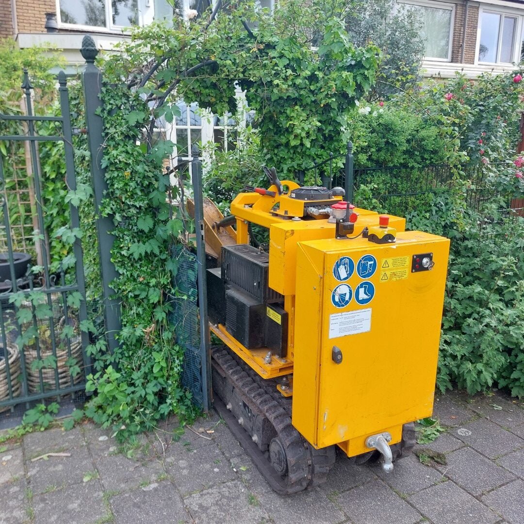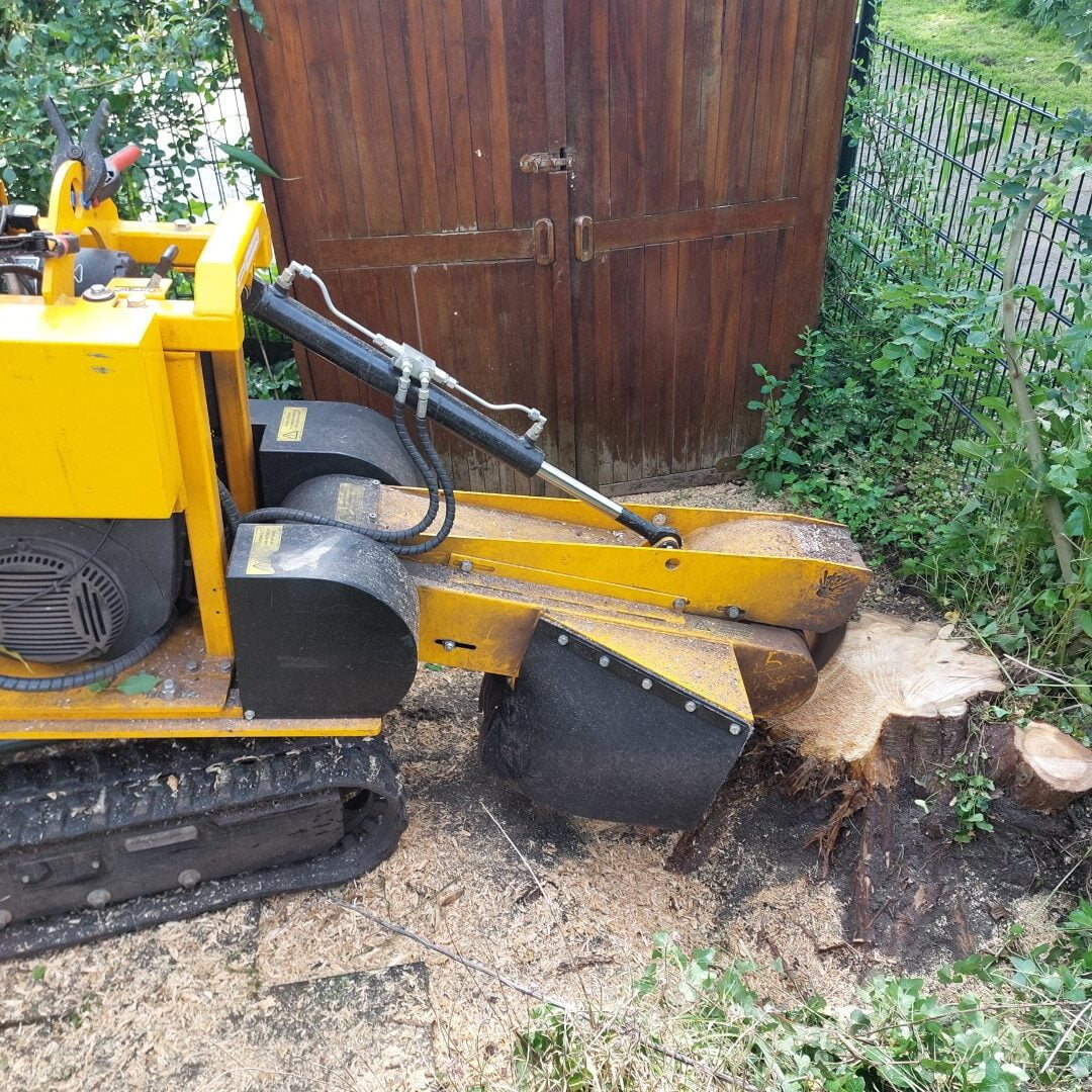 Ik had vandaag “Rupsje” meegenomen. Onze stronkenfrees op rupsbanden. Daarom zijn heel grote boomstronken goed weg te frezen. Door het smalle formaat van deze frees was het mogelijk om door het hek van 75cm breed in de achtertuin te komen. Onze stronkenfrezen zijn net geen 70cm. Dus meestal lukt het om de een boomstronk te bereiken.