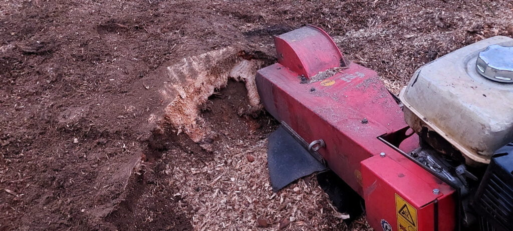 Tot slot heb ik de flink grote stronk met mijn hand freesmachine weggefreesd. Inclusief de dikste wortels. Zo kon de klant er weer gras overheen maken.