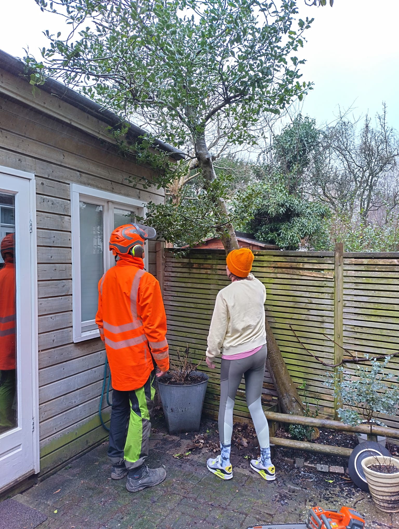 Stoelen, tafels en bloempotten aan de kant gezet en zo kon het boompje in de tuin vallen zonder iets te beschadigen.