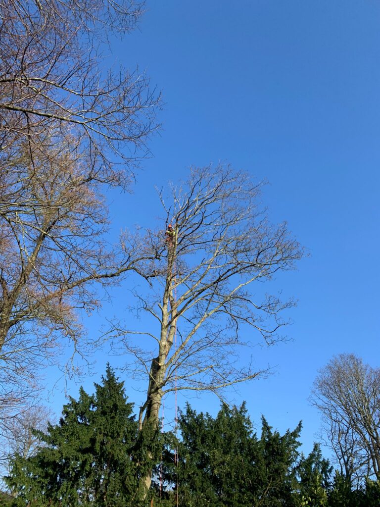 Om de schuur en het gazon van de buren te beschermen zijn een aantal takken aan touw naar beneden gelaten. Deze boom was zo’n 20 meter hoog.
